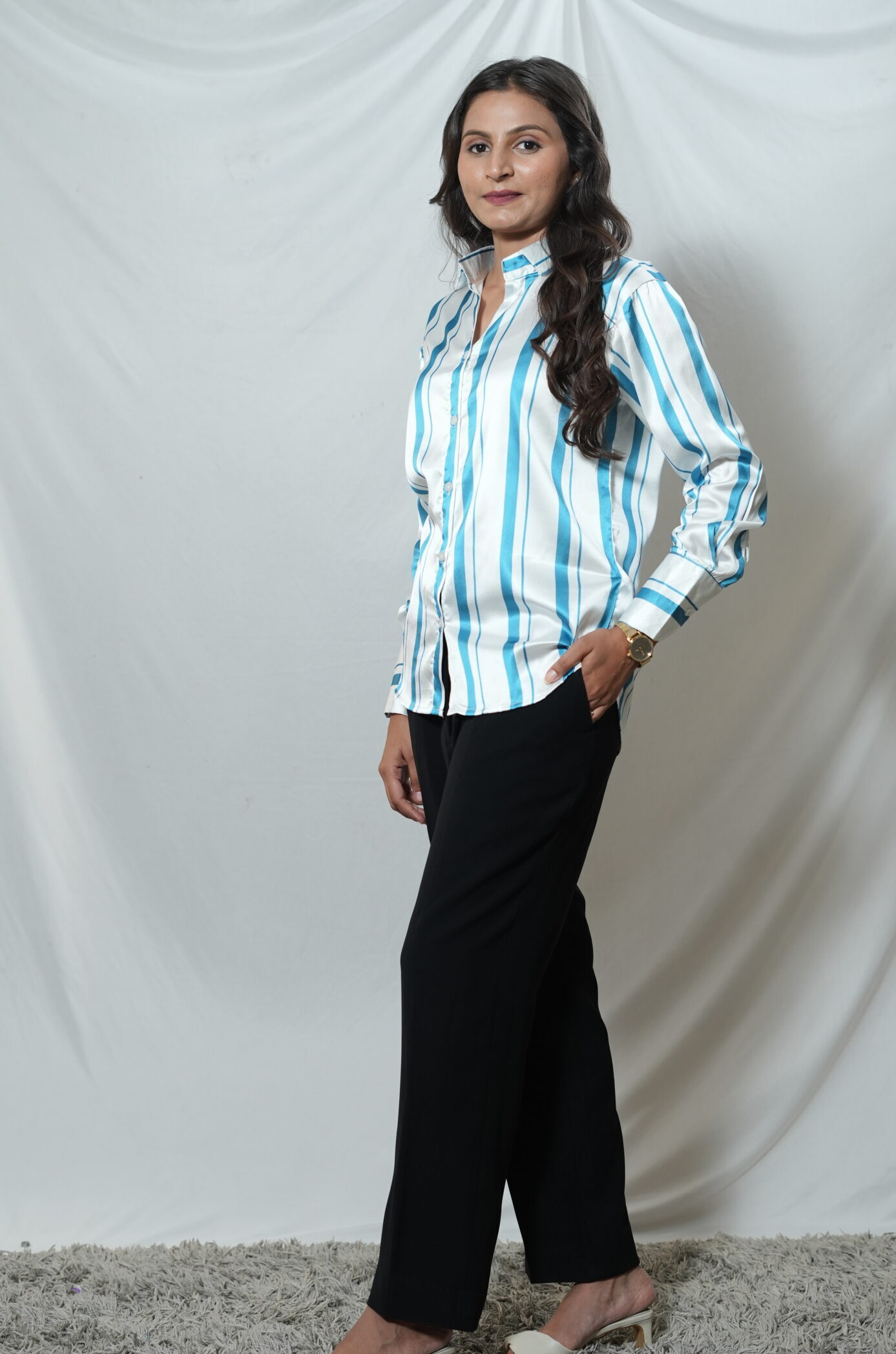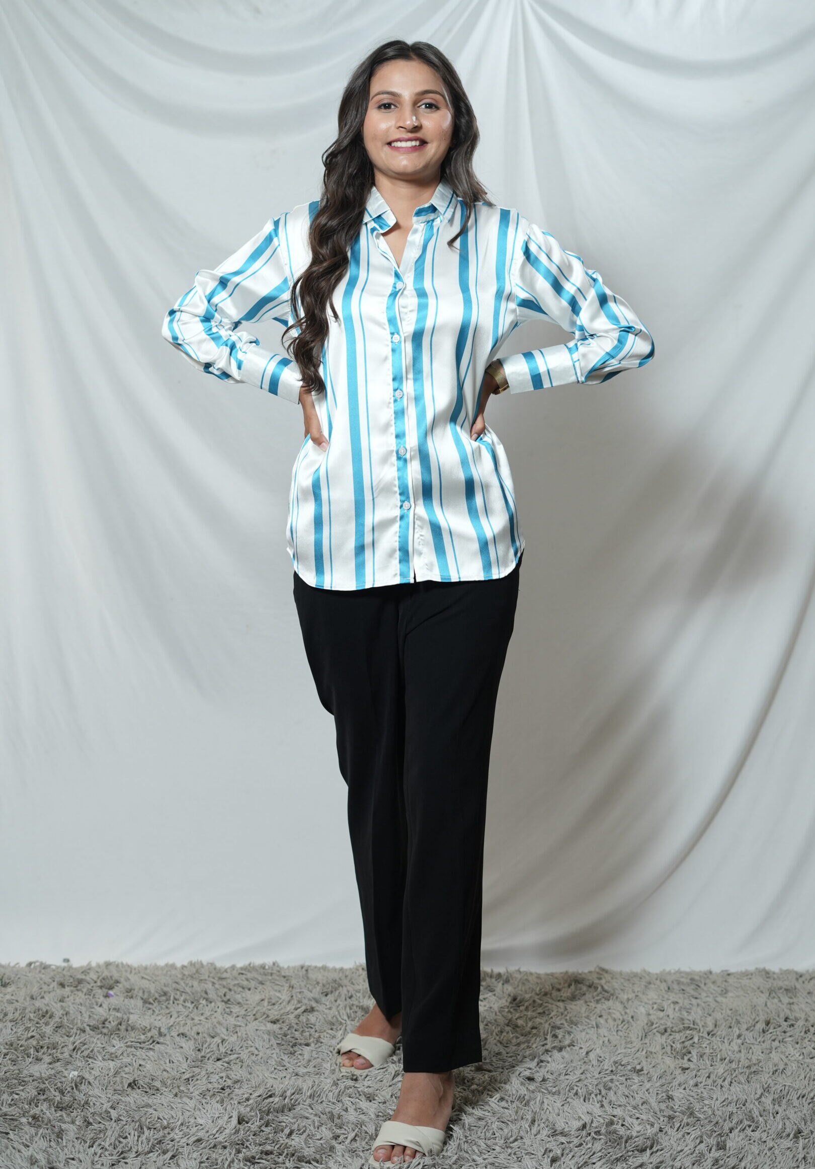 The Blue Stripe Satin Shirt is super comfortable and stylish. The fabric feels soft and smooth on the skin, and the fit is just perfect. Totally worth the price!