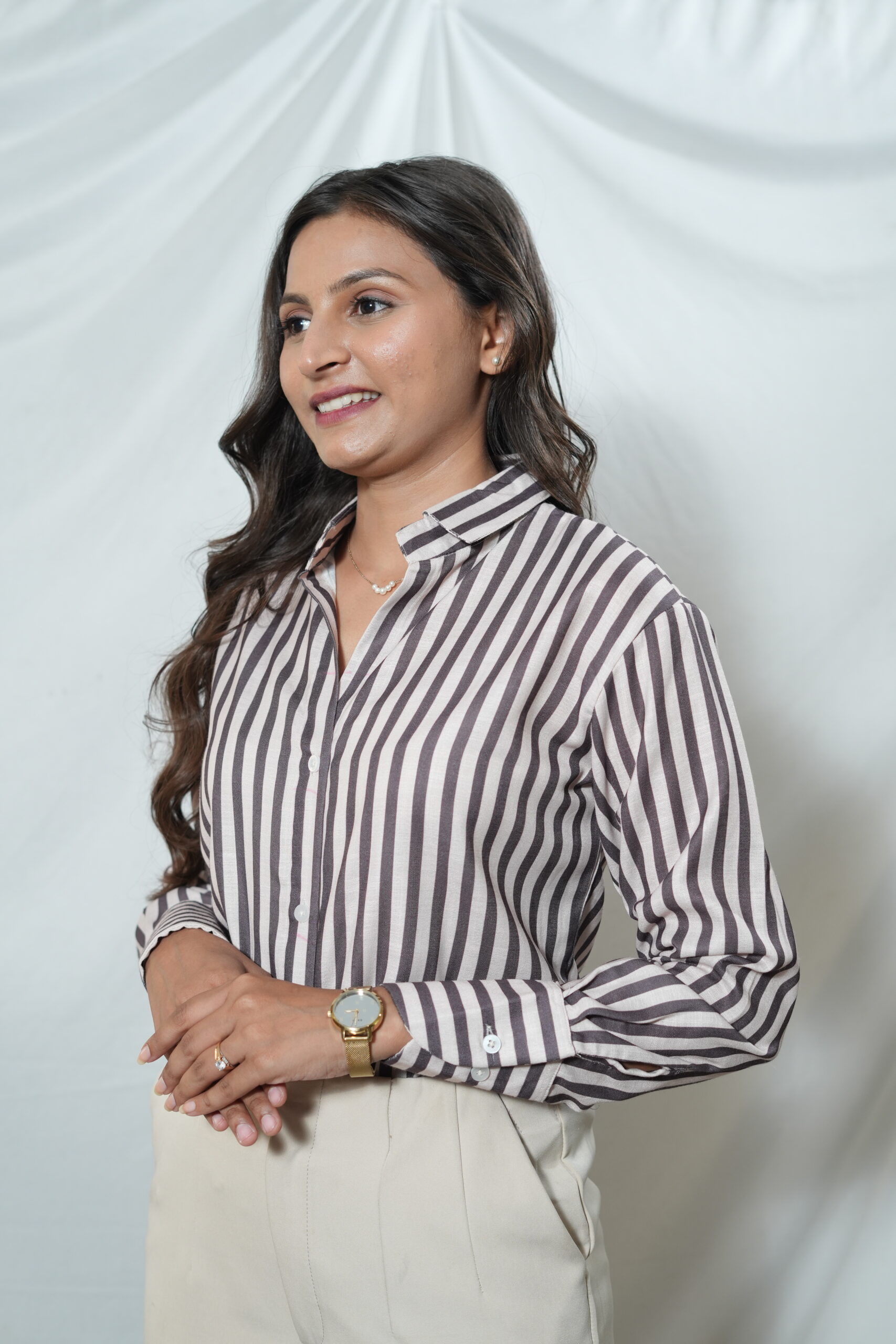 Collared shirt with a v-neck and long sleeves. Button-up front.