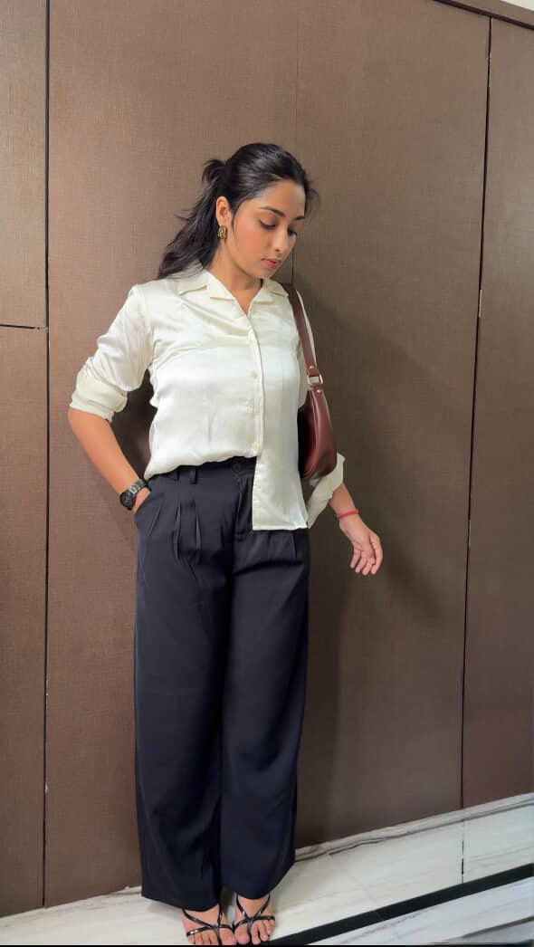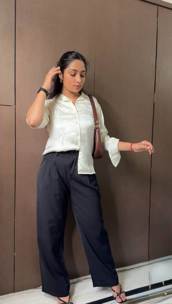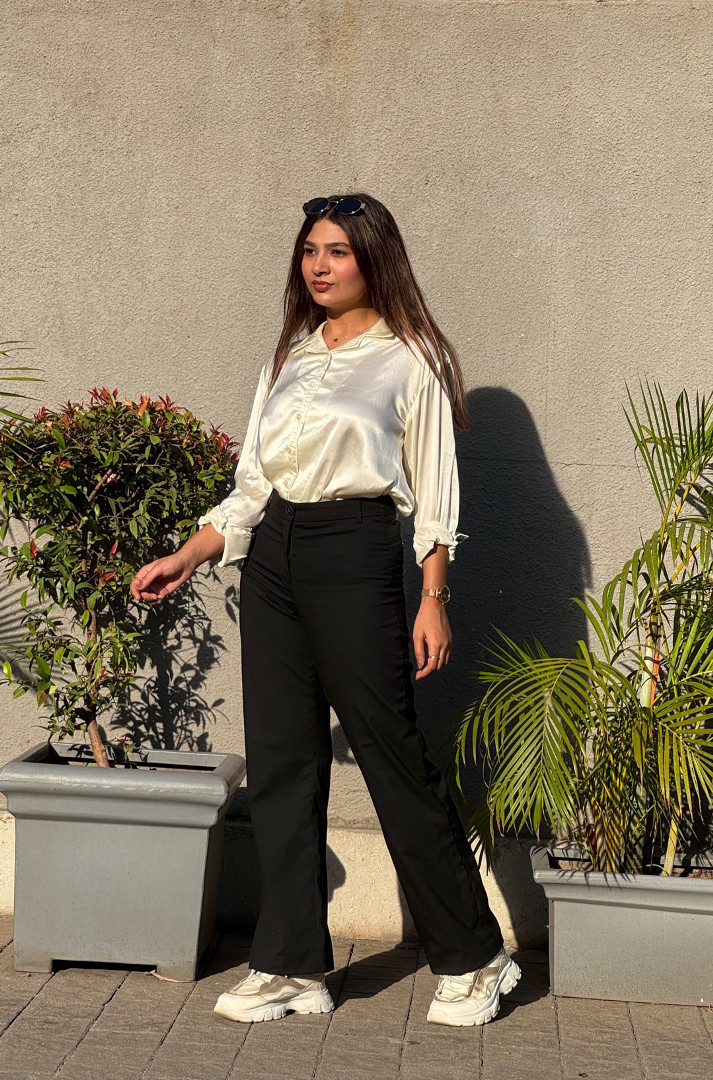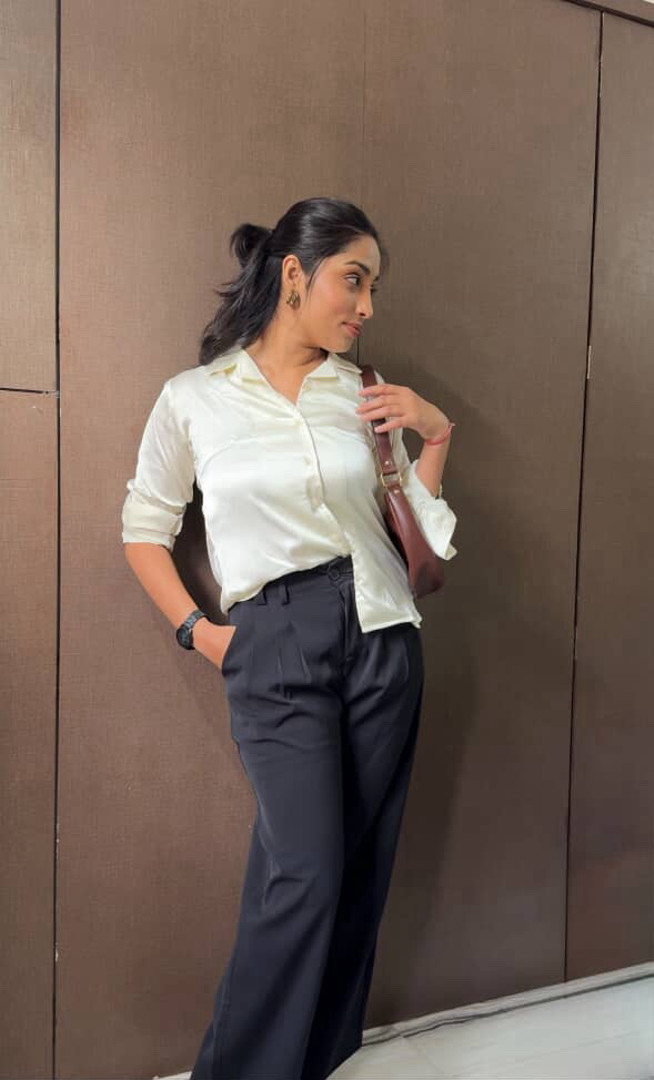 Collared shirt with a v-neck and long sleeves. Button-up front.